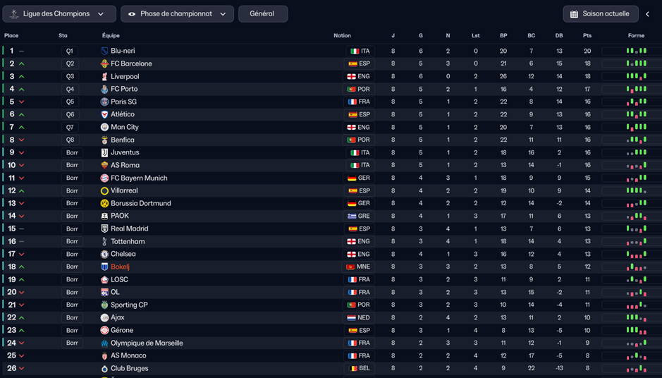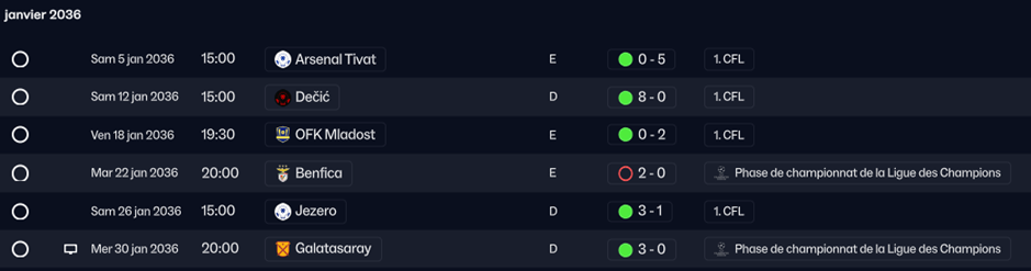 2 victoires maitrisées face à Qarabag et Slovacko, un 2-2 aussi logique à Lisbonne, le fameux 3-0 contre City puis la défaite minable contre le Benfica. Enfin, victoire au top contre Galatassaray.