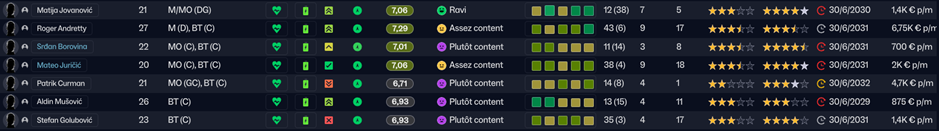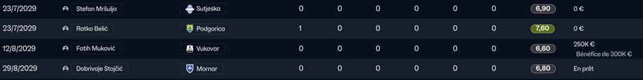Nous avons dĂ©cidĂ© aussi, avec notre jugement des opportunitĂ©s sur le marchĂ© des transferts, de mettre en avant la jeunesse du club. Nous savons le risque que ça comprend, et que ces joueurs ne seront peut-ĂȘtre pas dâune grande aide en Europe, mais nous avons confiance en eux. Montent donc en Ă©quipe premiĂšre Danijel Sinonavic (DC), Nikola Jalenkovic (MD), Aleksandar Nenadic (MC), Mathieu Simonnet (Att) et Jovan Lopicic dans les buts.