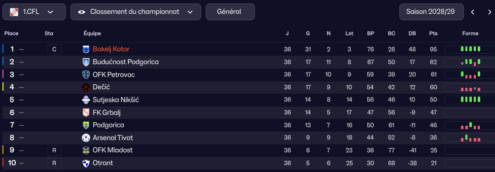 Bonjour Ă tous, la saison 2028-2029 a pris fin ! Et surprise ⊠Non, pas de surprise, on a roulĂ© sur le championnat. Et la coupe, pareil, avec une demie finale face Ă une rĂ©serve et une finale face au 6Ăšme de deuxiĂšme division. Mais bon, ce nâest pas notre faute si les autres se sont fait Ă©liminer avant.