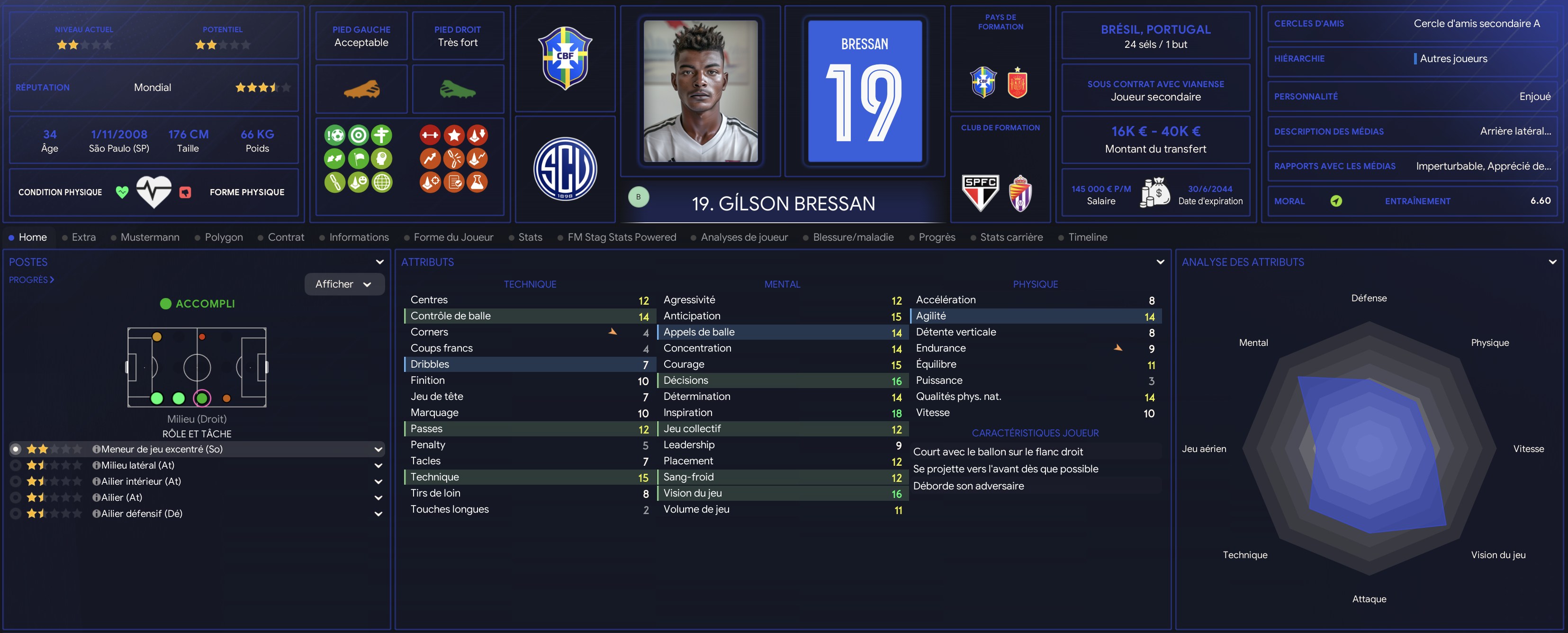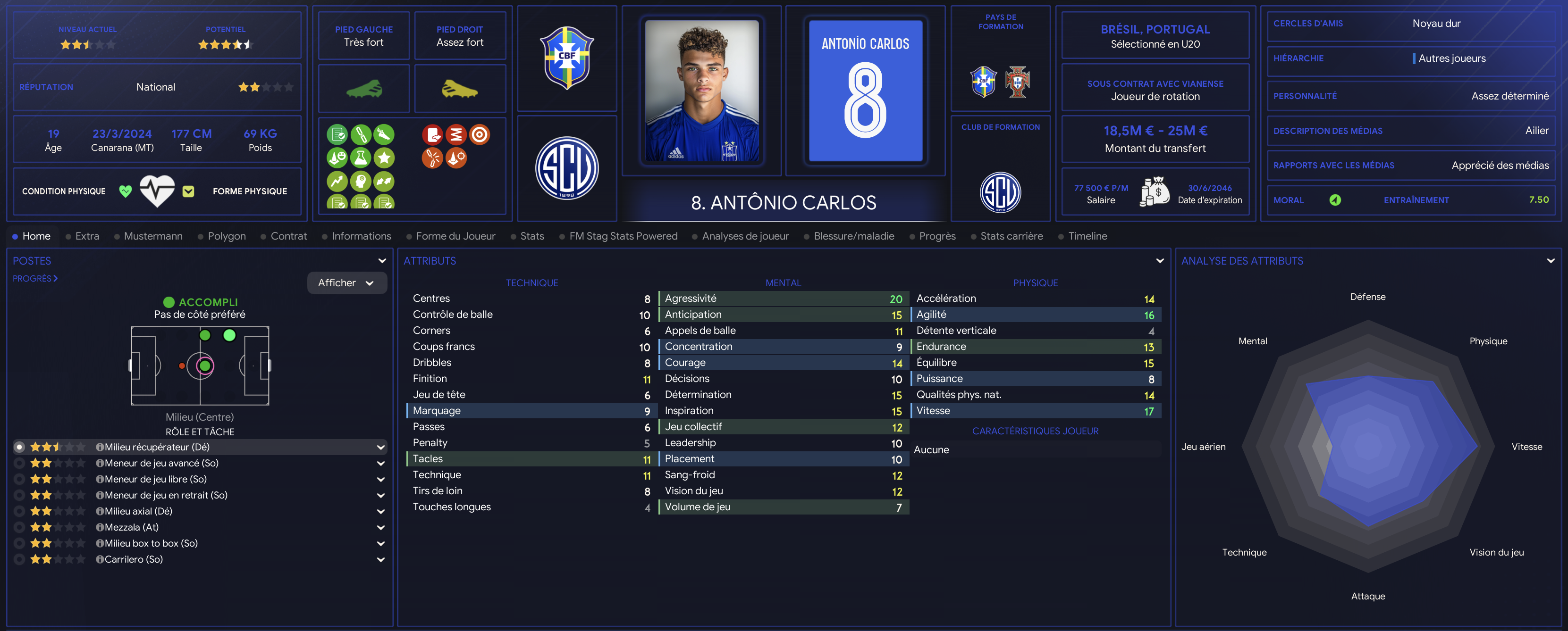 Antonio Carlos est un jeune brĂ©silien nĂ© au Portugal. Polyvalent il peut Ă©voluer sur plusieurs postes comme milieu central ou comme ailier gauche. Il a une forte appĂ©tence pour jouer dans half space gauche. Antonio a un bel avenir devant lui. SollicitĂ© par le Portugal pour Ă©voluer en Espoir il attends toujours la seleçao pour le moment. La saison passĂ© il a encore grandi en doublant son nombre dâapparitions avec des stats intĂ©ressantes. Il va devoir confirmer cette saison comme doublure de SĂ©rgio Mata principalement.