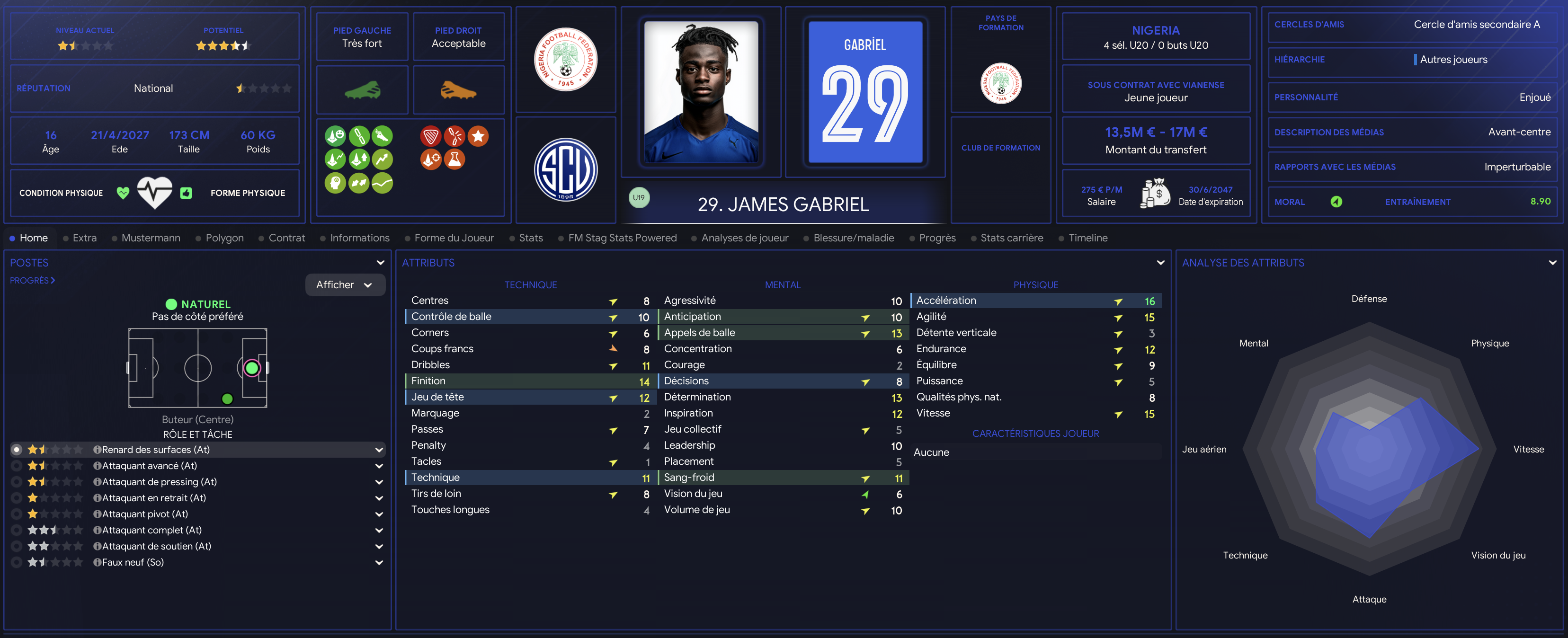 James Gabriel est un jeune buteur polyvalent capable dâĂ©voluer Ă droite. NĂ© Ă Ede au NigĂ©ria, il rejoint le club suite Ă lâouverture de lâacadĂ©mie de Vianense Ă Lagos. Prometteur buteur, il va apporter de la compĂ©titivitĂ© dans lâĂ©quipe des U19. Il a pris le rĂŽle de doublure en U19 lâan passĂ© derriĂšre Adilson Ă droite, derriĂšre Adjei en pointe. Il va devoir montrer quâil en veut vu la concurrence Ă ses postes de prĂ©dilection. La sĂ©lection nigĂ©riane sâintĂ©resse Ă lui et le surveille de prĂšs.