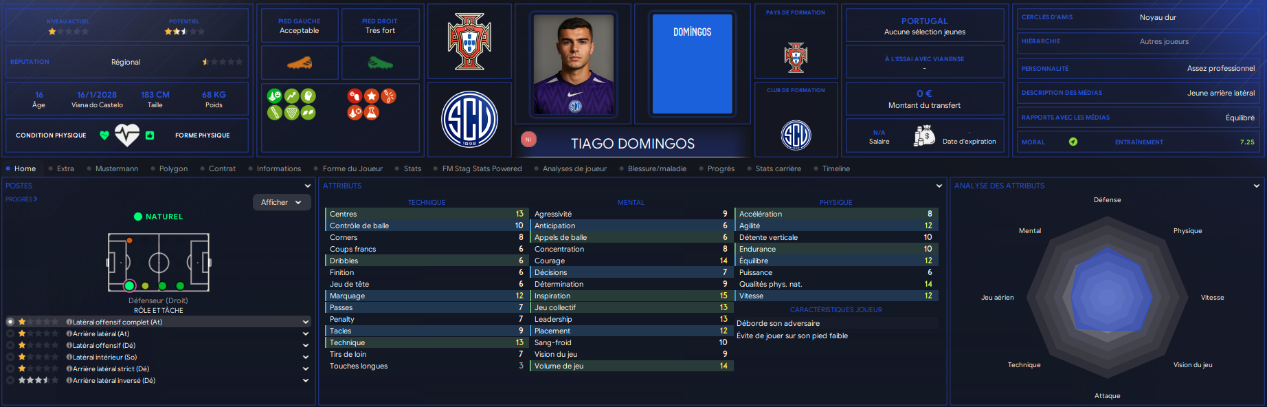 Tiago est un jeune dĂ©fenseur portugais. RecalĂ© par le centre de formation de Braga il a Ă©tĂ© mis Ă lâessai par Vianense. Prometteur mais un peu fainĂ©ant il va devoir faire ses preuves pour obtenir le tant convoitĂ© contrat pro.