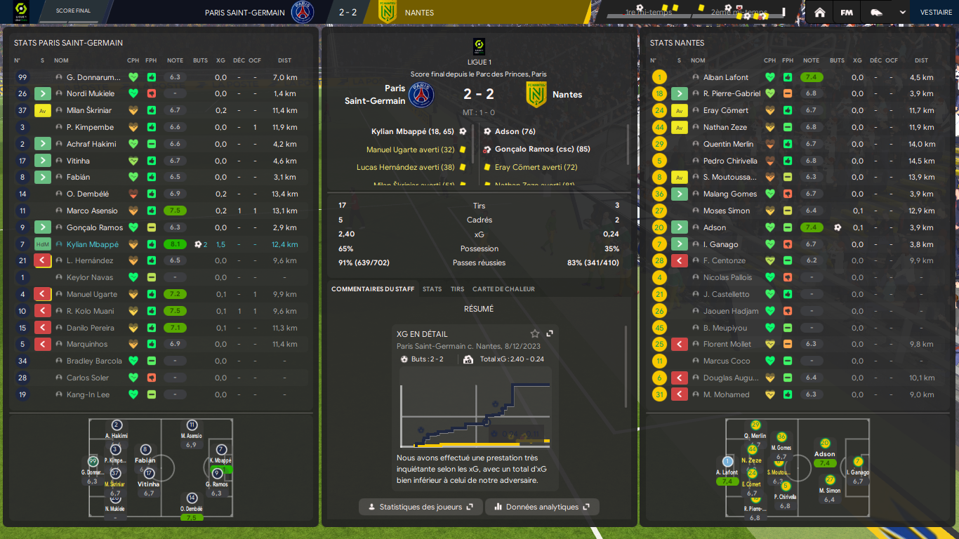 Put*** !! On accroche le PSG au Parc dans notre schĂ©ma tactique du sapin ! Qui lâeut cru ?! Quel travail de tous mes joueurs, en particulier les offensifs Ă qui jâai demandĂ© de sâadapter Ă un nouveau rĂŽle (Simon, Coco, Marquinhos, AppuahâŠ) Ils ne jouent plus dans leur rĂŽle prĂ©fĂ©rentiel dâailier, mais ont toute cette libertĂ© de se promener, se projeter sur tout le front de lâattaque et ça leur rĂ©ussit plutĂŽt bien ! Adson & Mollet sont quant Ă eux heureux car ils retrouvent un poste axial quâils prĂ©fĂšrent.