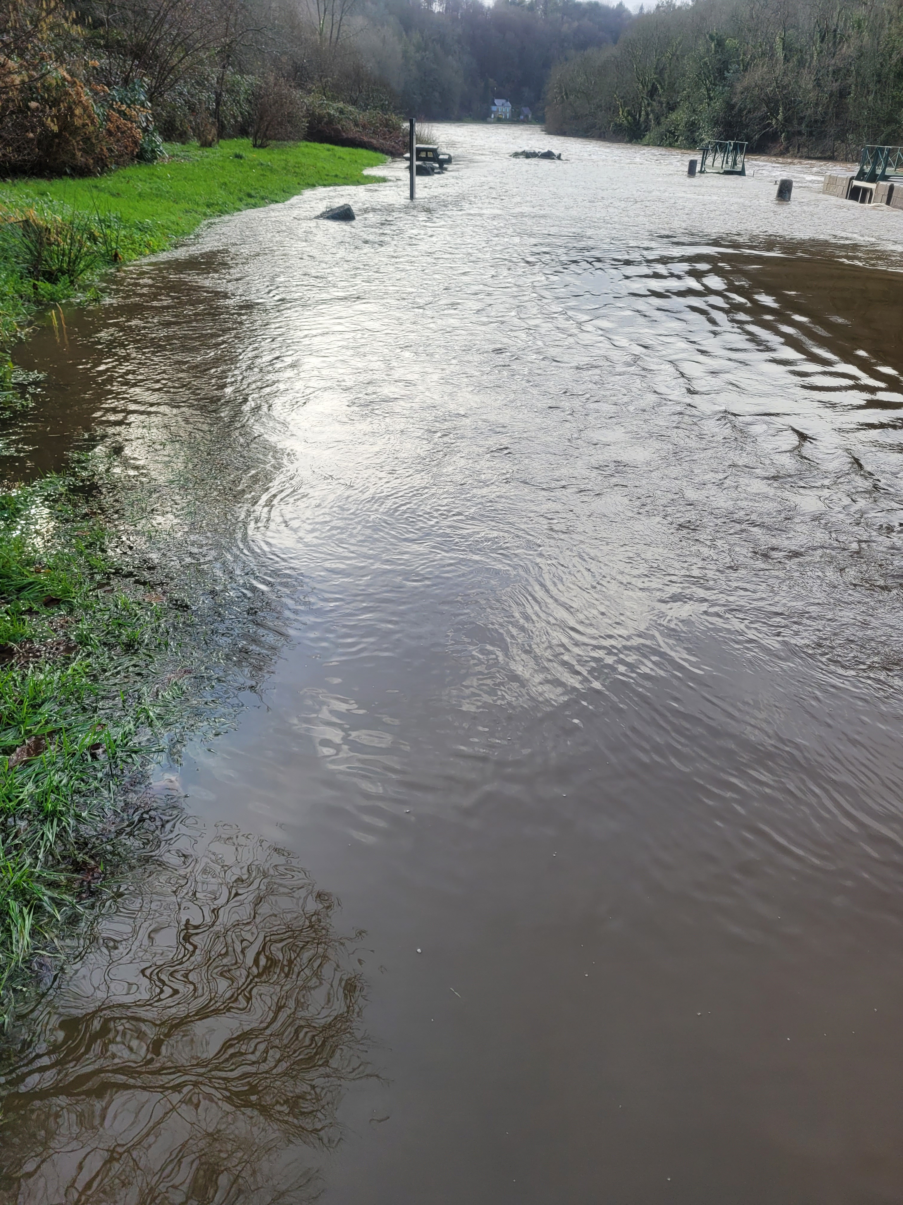 Et aujourd’hui on est de plus en plus proche d’un débordement à l’entrée d’Inzinzac-Lochrist. Ma fille m’a envoyé une photo, si y avait pas eu un terre-plein d’ajouté, l’eau serait déjà passée…