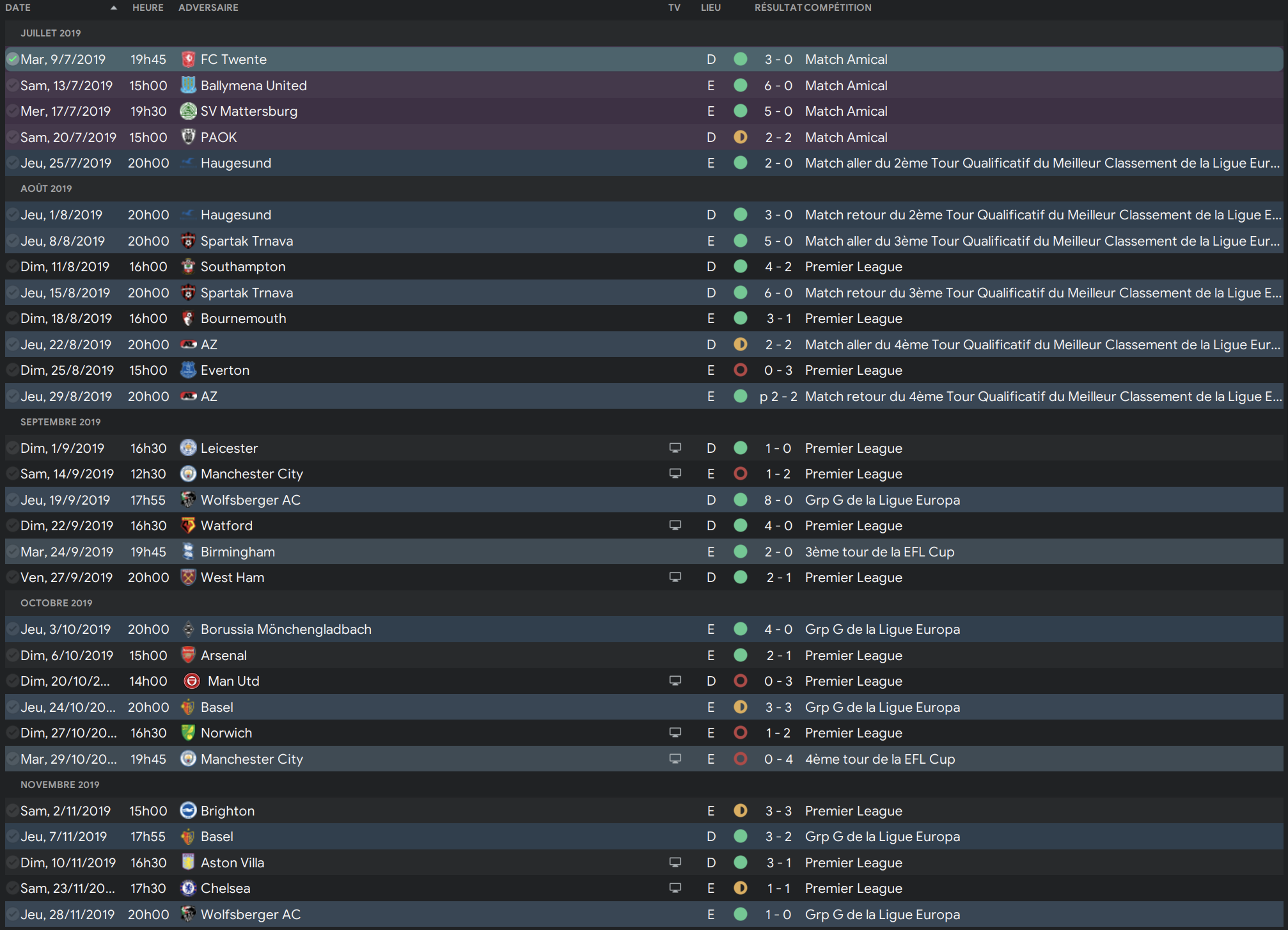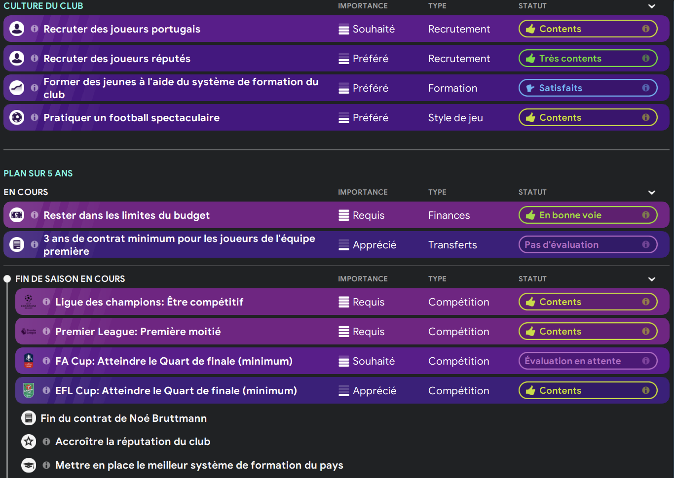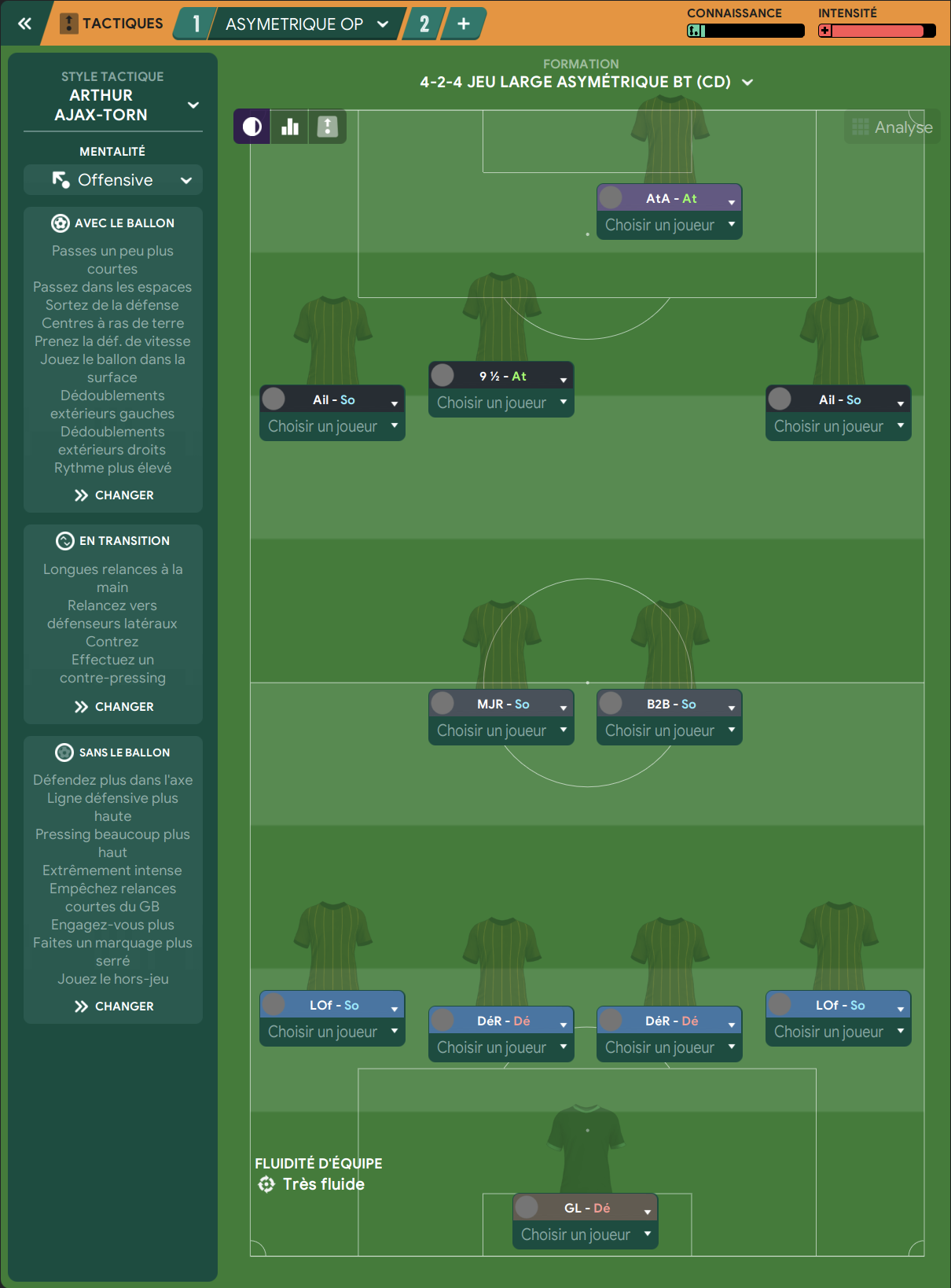 Honte à moi car j’ai allègrement copié une tactique toute faite mais j’avoue que l’aspect tactique n’est pas ce qui m’intéresse le plus dans FM. Cependant les résultats obtenus avec sont plutôt bons et cette tactique produit un football spectaculaire comme le souhaitent les dirigeants.