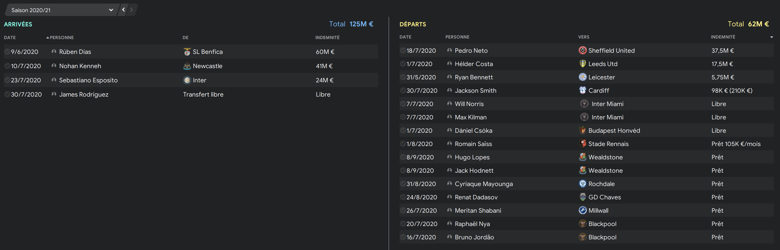 Avec un budget de +90M, j’ai pu faire pas mal de choses. Beaucoup de jeunes partis en prêt et de joueurs libres mais le principal. départ est celui de Pedro Neto (que j’aurais surement dû vendre plus cher).
