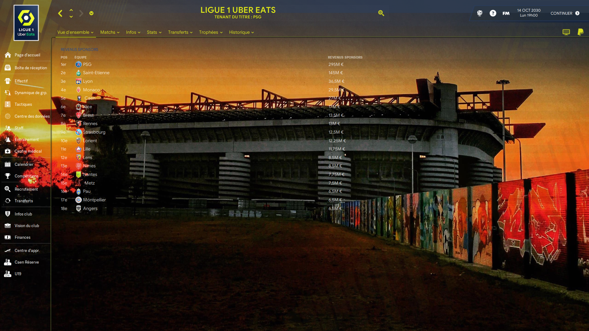 Retour en France, où Lyon cherchait un nouveau coach après une 6e place un peu décevante. Mon but sera de retrouver les sommets en faisant façe au nouveau ogre du foot français : le Stade Malherbe de Caen !! ![]()