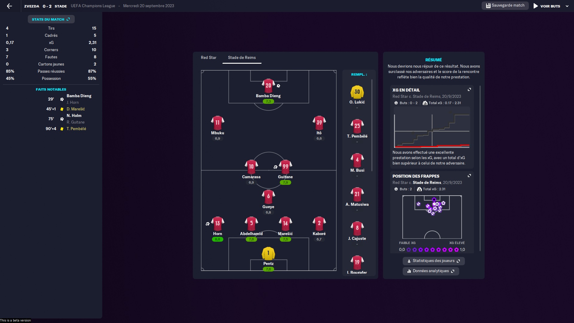 Salut @TheGreatest , j’ai rattrapé mon retard de lecture. Tu te laisses prendre au jeu dis donc! Vu tes moyens, le recrutement est pas mal du tout. Visiblement t’as chipé Bamba Dieng, et on a vu Horn titulaire pour le 1er match de LDC. le prochain match sera bouillant à Delaune : le public va venir en masse pour que tu n’abandonnes pas cette partie !