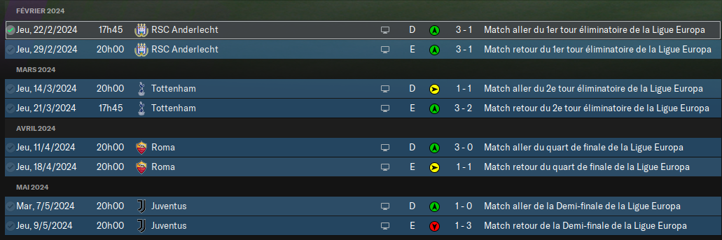 Reversés en ligue europa après le parcours moyen mais correct pour une première, l’équipe réussi l’exploit de s’offrir un parcours jusqu’en demi finale.