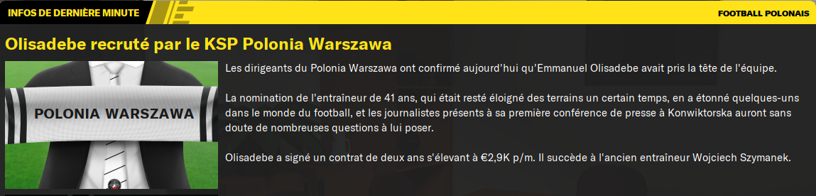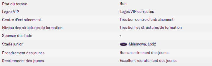 Le Polonia Warszawa, j’ai déjà fait une partie avec eux, avec des transferts. J’ai fini en Ligue des Champions en 6 ans, avec des titres à la clef. En Lifeban, le challenge peut être intéressant. Mélange de vieux et de jeunes. Effectif de 24 joueurs valable pour commencer (mais 6 défenseurs, dont 3 polyvalents). Infrastructures corrects mais sans plus. Pareil avec l’encadrement des jeunes. Fragile financièrement, mais tu as un peu de marge grâce à une petite enveloppe transferts à réinvestir. Sa grande histoire est à déterrer.