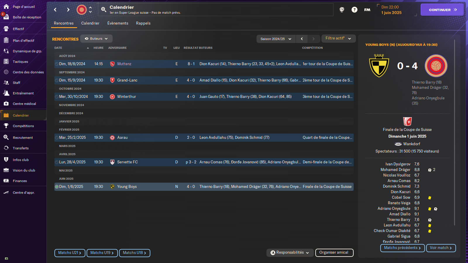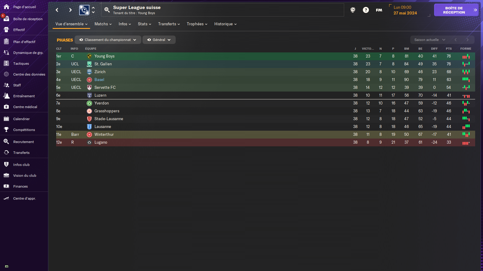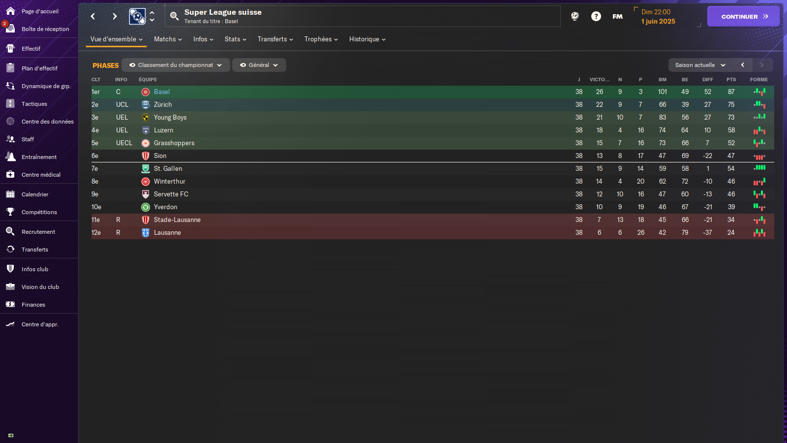 Premier titre de champion pour le club depuis 2017 ! On aura fait au cours de cette saison une serie de 21 matchs sans défaite ( de la 16e journée a la 37e) ce qui nous permet de succeder a berne et de jouer la ldc la saison prochaine
