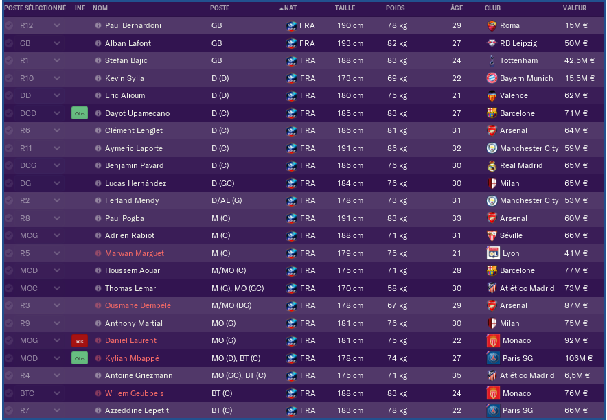 On retrouve les “grands” noms de la dernière décennie avec Paul Pogba, Ousmane Dembélé, Antoine Griezmann et le quintuple Ballon d’or Kylian Mbappé.