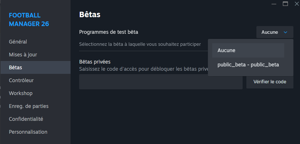 - Selectionnez l’onglet Betas sur la sidebar gauche de la fenêtre etsélectionner la branche public beta. Cf l’image ci-dessous.