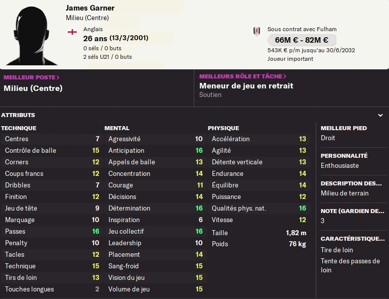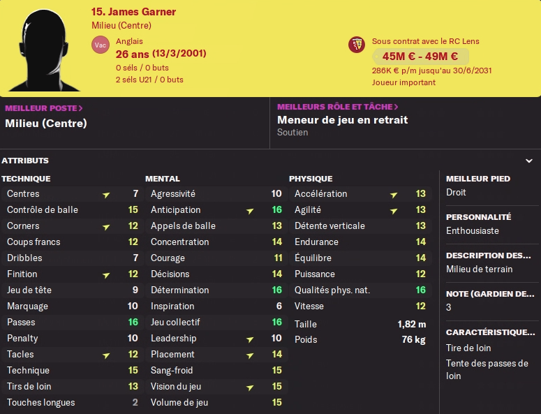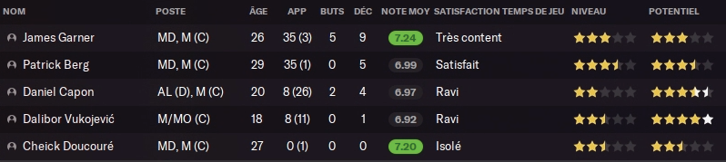 Petite flashback : il y’a deux ans, je repère en fin de contrat un jeune anglais de Manchester United James Garner (pour l’anecdote il était titulaire dans mon équipe de Nott Forrest dans une autre partie). Je le recrute comme doublure de mon duo Berg/Fofana et il fait tellement bien l’affaire que je m’autorise un départ de Fofana l’été dernier. Cette année en tant que titulaire il a été très bon, avec une superbe note moyenne et une jolie contribution aux stats offensives.