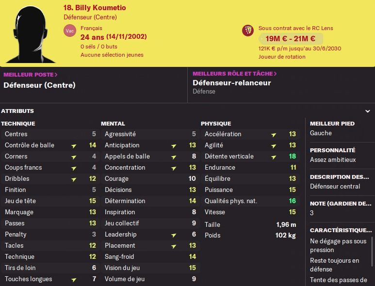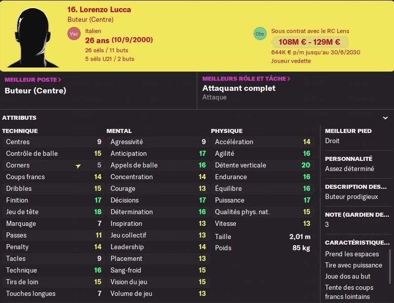 Y’a t-il besoin de présenter la superstar de notre équipe Lorenzo Lucca ? Une saison en boulet de canon avec 42 BUTS en 37 titularisations. Le héros de Bollaert a tout fait cette année et nous a offert un nombre incroyable de points. Facile à trouver sur corner, il nous offre la tête du classement des buts sur corner en Ligue 1. A 26 ans il est en pleine forme et sera surement observé par tous les gros clubs européens. Mais il est estimé à plus de 120M€. Venez le chercher ! Il a prolongé l’été dernier pour le plus gros salaire du club (644K€ plus de 300K€ de plus que tout le monde) mais le justifie sur le terrain. (voir sa fiche)