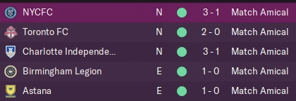 Nous faisons de bonnes performances en faisant jouer tout le monde. Des victoires un peu courtes contre Charlotte et Birmingham qui ne sont pas en MLS, mais nous avions fait tourner. Nous rentrons en Europe avec un petit détour par Astana histoire de rencontrer une équipe de niveau Europa League, et nous imposons sans trop trembler. Lucca reste notre meilleur buteur même en amical, mais on a eu pas mal de variété de buteurs, ce qui est bon signe en cas de départ ! Je pense que nous sommes prêts !