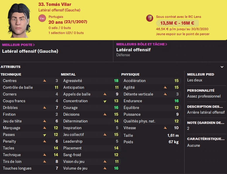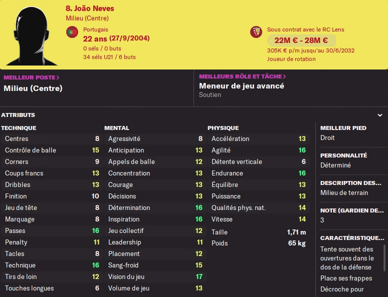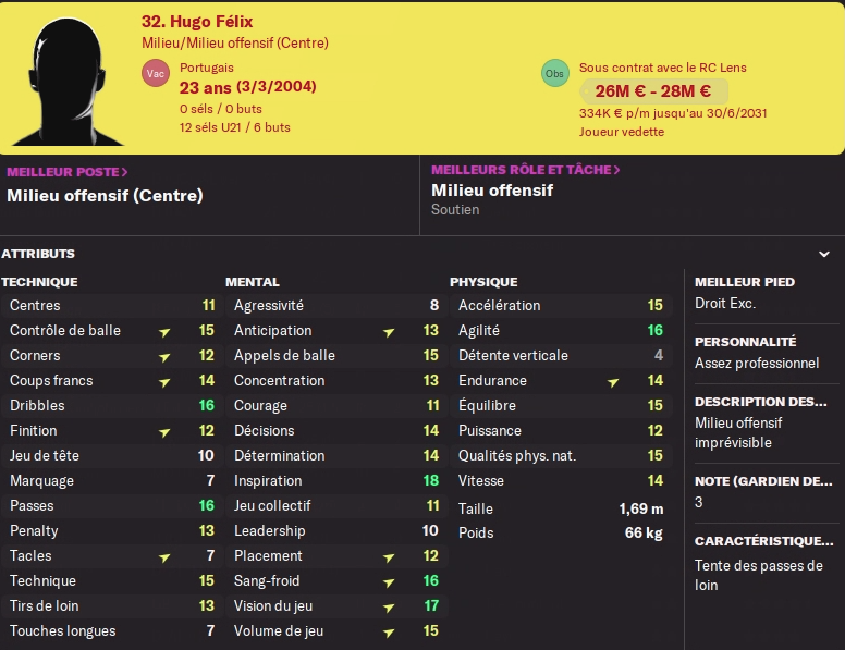 Le remplaçant a été trouvé dans la foulée, j’avais une petite dizaine de nom sur ma shortlist, j’ai négocié avec plusieurs d’entre eux mais le rapport qualité/prix semblait plus intéressant pour ce milieu axial portugais de 22 ans qui nous vient de Fribourg. Il sort de deux saisons exceptionnelles en Bundesliga : 6 matchs - 6 buts - 8 passes - 7.28 de moyenne il y’a deux ans ; 32 matchs - 3 buts - 6 passes - 7.19 de moyenne l’an dernier. 5 matchs européens d’expérience ce n’est pas énorme surtout en Conference League.