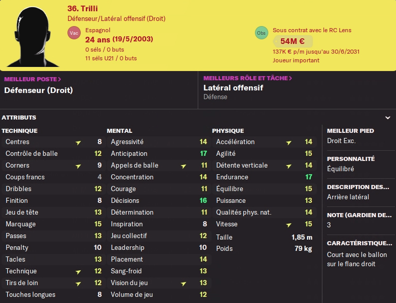 Le titulaire trilli réalise lui aussi une très belle saison avec une jolie contribution au jeu offensif. J’attendais un peu plus de passes décisives de sa part, mais je ne vais pas me plaindre. Convoité par le Barça cet été, il l’a pas bronché quand j’ai refusé l’offre mais veut voir de grosses recrues cet été… Dans le cas d’un départ, je devrais toucher un très gros chèque ! (voir sa fiche)