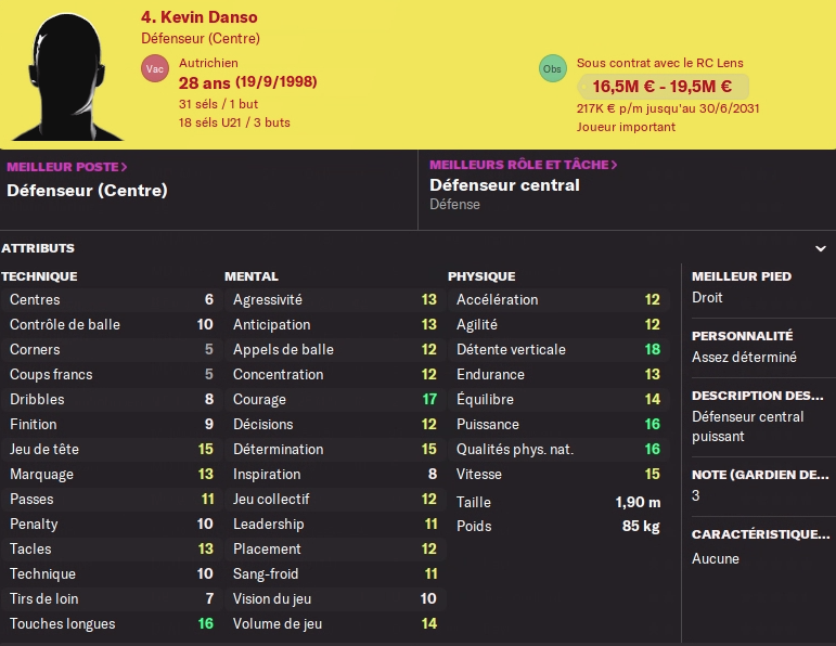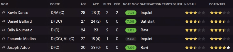 Enfin Danso notre défenseur autrichien avec nous depuis mon arrivée au club m’a fait peur de son souhait de finir sa carrière en Premier League. A 29 ans et alors que sa place de titulaire est bien concurrencée, j’ai accepté cette idée pour le prochain mercato. Il est évalué à 20M€, ce qui m’offrira un budget sympa pour le remplacer.