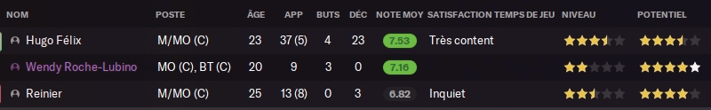 Et mon meneur de jeu Félix aimerait partir dans un plus grand club mais je ne lui ai pas fait de promesse. Un ou deux de ces départs chambouleraient complétement mon effectif, je croise les doigts pour qu’on tienne jusqu’à la fin du mercato !