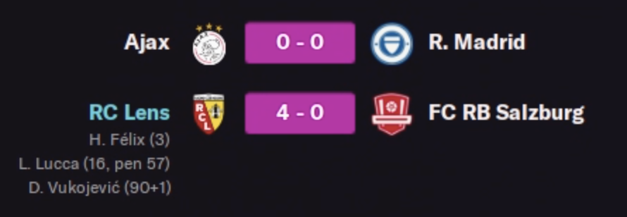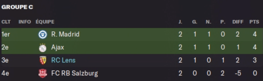 Salzburg n’a pas eu beaucoup d’espoirs contre nous. Nous avons dominé ce match de la tête et des épaules, avec mon équipe quasiment type car on ne pouvait pas laisser de points dans ce match. Au final on repart avec 3 points, un carton contre eux et donc la quasi assurance de finir devant eux au classement, et l’espoir de poivoir battre l’Ajax qui a eu du mal à les battre chez eux. Ajax qui accroche pourtant un nul contre le Real qui pourrait au final bien faire nos affaires. On jouera vite à Amsterdam ce qui nous permettra d’y voir plus clair sur nos chances dans ce groupe, mais un printemps européen est déjà quasi assuré :