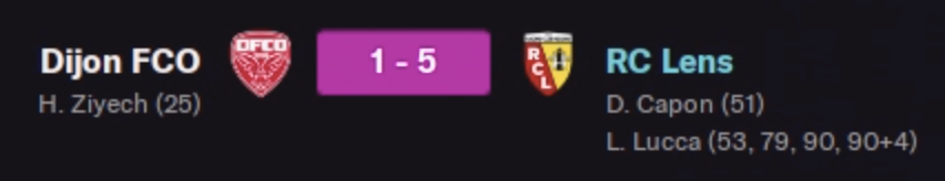 Nous étions menés 1-0 à la mi-temps sur le terrain de Dijon… oui Dijon. Avec un but Ziyech, oui le Ziyech (qui m’a mis un but environ 1mn après que je dise « oh c’est le Ziech ? »). Bon, visiblement ma gueulante dans les vestiaires a fait son effet, puisqu’on leur en met 5 en deuxième mi-temps. J’ai beaucoup apprécié que mes joueurs continuent à pousser même après avoir fait le break. Et Lucca se régale et peaufine ses stats histoire de rester le meilleur buteur d’Europe. Capon nous marque un but de renard lui qui dépanne au poste de latéral droit en ce moment. Beaucoup d’autres satisfactions : Gudjohnnsen devant, Félix derrière eux, Koumetio en défense centrale. Petite déception pour Moreno, mon gardien remplaçant qui ne profite pas trop de l’absence pour deux semaines de Martinez.