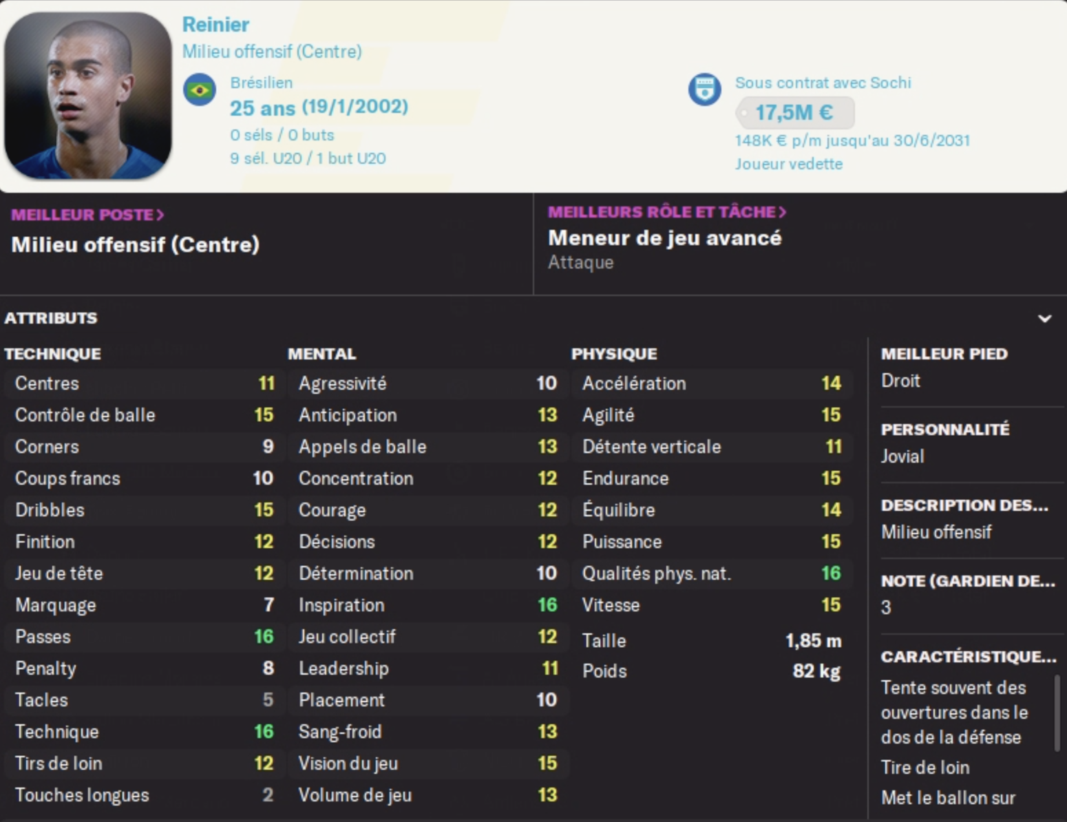 C’était prévisible, notre MOC Rainier nous quitte juste après la fin du mercato français pour le club russe de Sochi. Arrivé il y’a l’an dernier pour 2.7M€ je souhaitais le relancer après des années à végéter en réserve du Real. mais la brésilien n’a jamais rien montré avec nous : 14 matchs, 3 passes décisives et 6.86 de moyenne. Sachant qu’il a systématiquement été titularisé contre des petites équipes en Coupe, pas reluisant. J’avais du le retirer de la liste des joueurs inscrits pour la LdC cette année, ce qui lui a déplu, je le comprend.