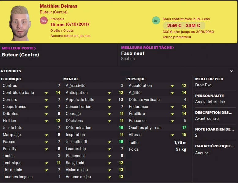 Et puis, mon centre de formation a sorti cette pépite : delmas a tout pour réussir au club. Mes préparateurs me l’annoncent avec le potentiel pour devenir aussi fort que Lucca, ce que je lui souhaite. Il est déjà complet, progresse bien, a un mental très solide et un physique quasi prêt pour la L1 même si il doit s’étoffer. A 15 ans il en a le temps, j’aimerai l’intégrer au groupe pro, lui faire jouer des bouts de match et qu’il apprenne auprès de nos stars. Je crois très fortement en lui ! (voir sa fiche)