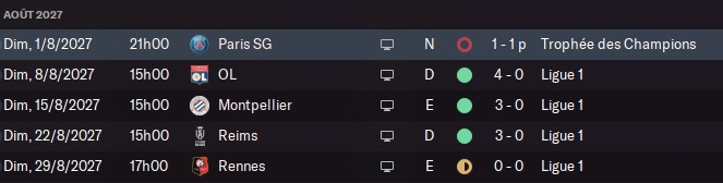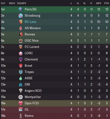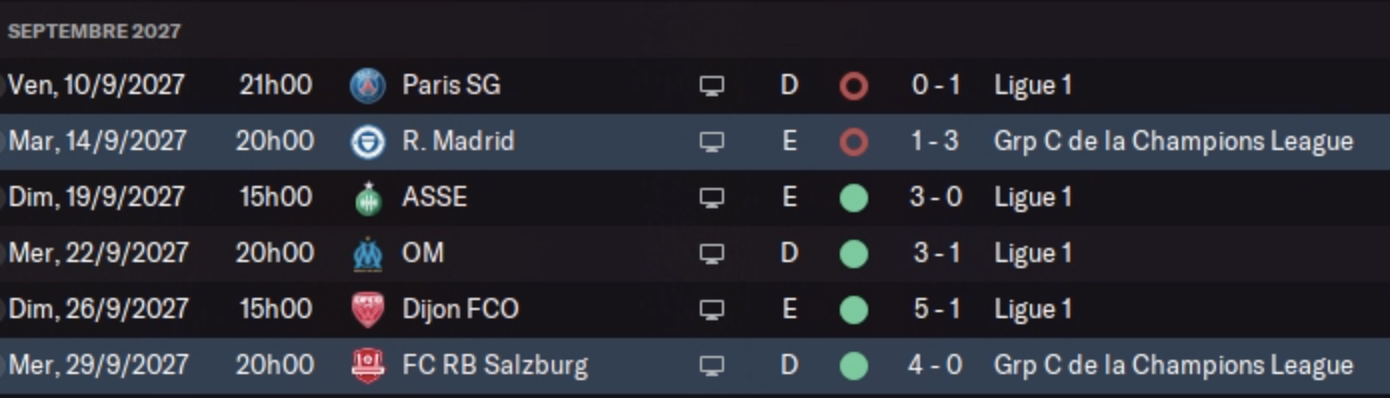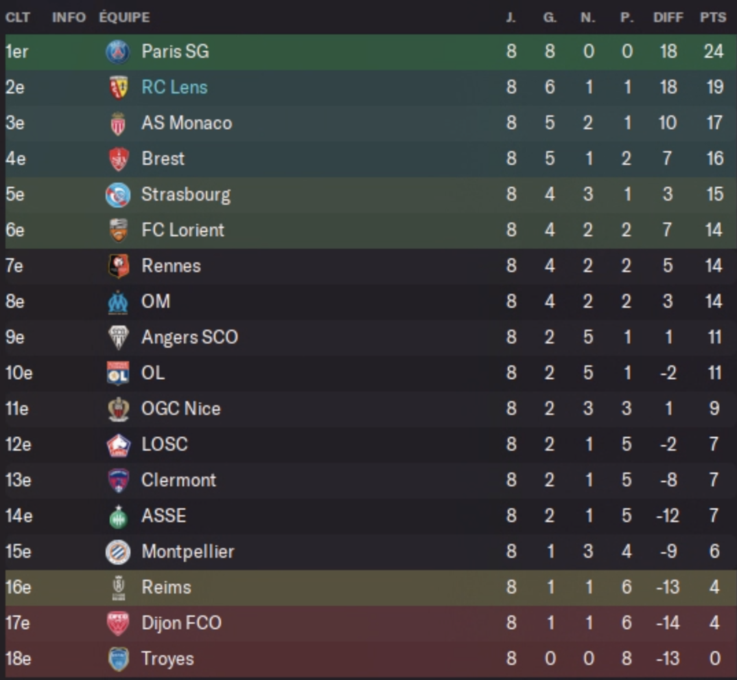 Forcément il fallait se douter que le PSG ne nous laisserait pas la moindre miette et prendrait déjà deux points d’avance sur nous au classement. Plus grosse surprise : Strasbourg réalise un début de saison de feu avec 100% de victoire, en battant tout de même Nice, Monaco et Brest, trois équipes au potentiel européen. C’est le genre d’équipe qui s’effondrera vite, et faire perdre des points à mes rivaux européen est finalement une bonne chose donc merci à eux !