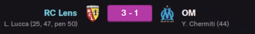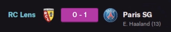 Un match disputé, dominé par le PSG. Nous avions une tactique plutôt défensive que j’ai fait évolué vers du plus offensif car Paris ne dominait pas énormément. On est puni par un superbe but de Haaland qui nous montre ce qu’est le top niveau. Un super attaquant en appelle un autre puisqu’on égalise en toute fin de match par Lucca de la tête bien sur. Nous avions poussé depuis quinze minutes ce qui équilibre les débats au niveau statistique. Au tirs aux buts malheureusement on en rate deux là où Paris avait pourtant raté son premier tir. Dommage, j’ai cru à un premier trophée avec Lens pour moi. On va se rattraper dans l’année promis ! Ce match pourrait être le symbole qu’on se rapproche des parisiens !