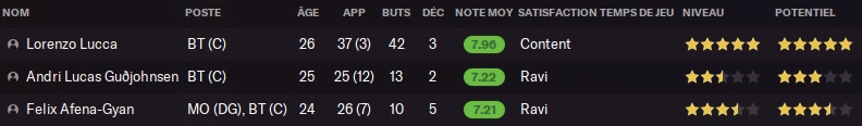 Derrière, c’était la lutte entre deux hommes car cette année j’ai fait le pari audatieux de ne partir qu’avec trois buteurs. Pari qui a coûté un peu de points en janvier/février car j’avais oublié la CAN. Gujohnnsen a pris un léger avantage dans cette course à la titularisation avec 13 buts et 2 passes, et son profil très similaire à Lucca n’a pas posé de problème. (voir sa fiche)