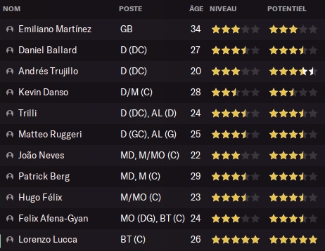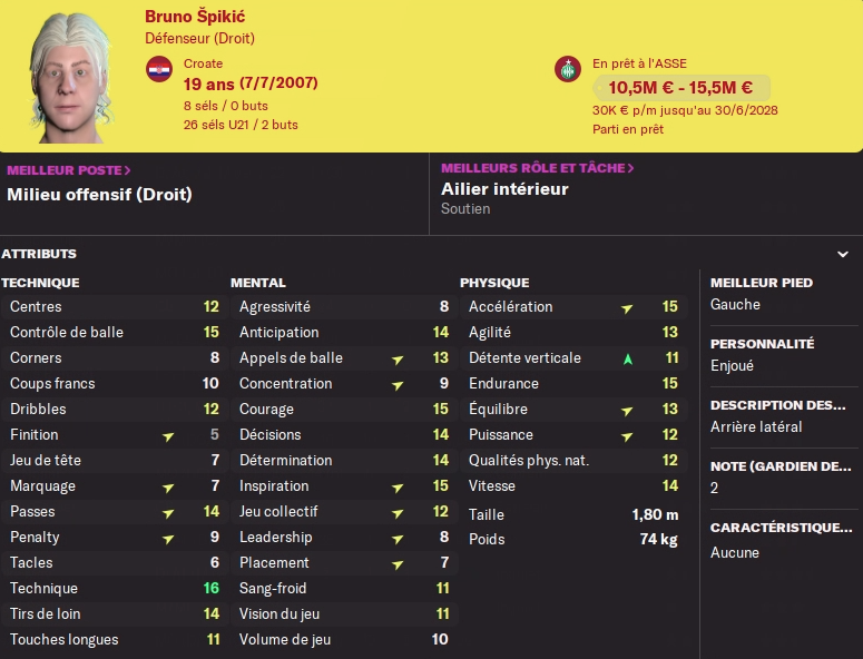 Recruté il y’a deux ans grâce à sa place dans le NxGn (ma principale source de recrutement de jeunes !), il a à nouveau été prêté cette année à Saint-Etienne. Bruno Spikic que j’appelle Viserys Targaryen, a réalisé une saison quelconque avec les verts malgré sa place de titulaire : 29 matchs, 2 passes, 6.42 de moyenne. Les verts ont fini 14ème de L2, ça n’aide pas. Il a le potentiel pour se faire une place dans l’effectif. Peut être que la vente de Trilli rapporterai beaucoup tout en libérant une place pour lui ? (voir sa fiche)