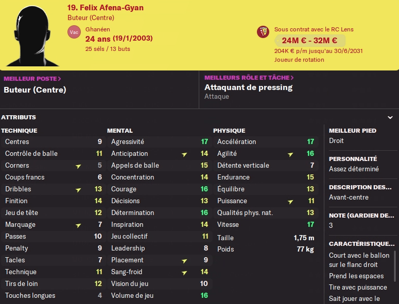 Le troisième larron est arrivé libre l’été dernier, et Afena-Gyan a fait des débuts en fanfare avant de se calmer sur le reste de la saison, finissant même un peu mollement (10 matchs sans marquer). 10 btus et 5 passes en 26 titularisations c’est pas mal mais il faudra monter le curseur pour être titulaire. J’aime son profil différent des deux autres, plutôt sur la vitesse et la profondeur. (voir sa fiche)
