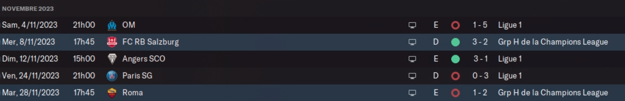 En Ligue des Champions, match extrémement frustrant contre la Roma qu’on domine tout le match avant qu’ils plantent en toute fin de match. On méritait au moins le nul ! Objectif maintenant : des points contre Salzburg sous peine de finir dernier du groupe. On s’impose 2-1 là bas dans un match maîtrisé, on est donc seuls 3ème de notre groupe.