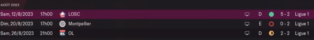 Un peu rude pour le moral, on commence en se faisant atomiser par l’OM. Je ne comprend pas comment on peut autant rater ce match. On a été ridicules (16 tirs dont 6 cadrés, 1.81 XG là où l’OM en a eu 2.40) mais ils ont marqué quasi sur chaque action dangereuse là où nous avons beaucoup vendangé. Ils nous collent trois buts dans les 5 dernières minutes de la mi-temps pour nous assommer…