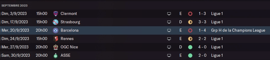 Derrière la défaite contre le Barça est logique et n’entame pas notre moral. On commence à sortir la tête de l’eau en choppant un nul à Rennes avant de bien se redresser en cartonnant Nice… Qui au passage est notre nouveau rival :
