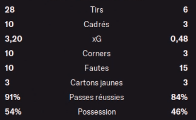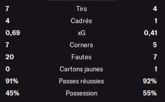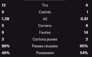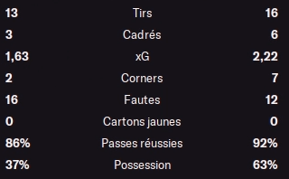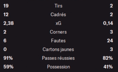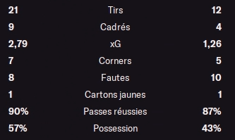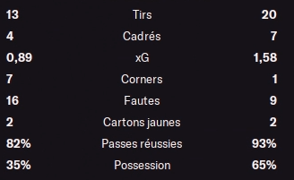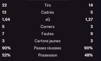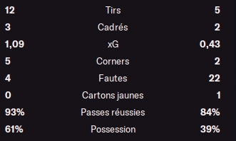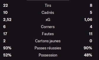 Le coach exigeant que je suis est tiraillé : on mène 4-0 à la 19ème minute et ça sent le match reposant. Je fais tourner avec des changements assez tôt. Derrière, on subit pendant quelques minutes un réveil palois. Je reste tout de même ultra surpris du réalisme de mes adversaires, 2 buts avec 0.14 XG, c’est des miracles à chaque fois ! Deux buts sur corner de la tête dans un angle assez fermé. Il faudra que je regarde si nous savons défendre les corners, mais ce genre de stats se répète et ça agaçe sur une saison…