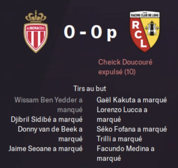 ET ON L’A FAIT ! Superbe performance défense de mes joueurs qui ont repoussé les monégasques qui n’ont jamais vraiment réussi à nous faire trembler. Ben Yedder a raté le premier tir au but, nous permettant d’être sereins pour la séance et de nous qualifier pour les demi-finales où nous affronterons le PSG !