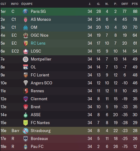 De notre côté avec 61 points c’est au final une belle saison. Dure à comparer aux autres avec 4 matchs en moins. Côté descente, Strasbourg a fini par perdre le barrage pour la montée de Reims, nous aurons donc 3 promus : Metz, Nîmes et Reims.