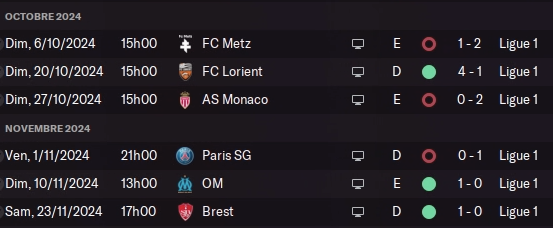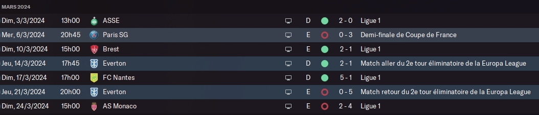 Bon bah c’est beaucoup moins bien ! Une défaite un peu bête contre le FC Metz. Ils ont fini le match à 10, et j’ai rapidement mis un but mais quasi aucune action offensive dans les 10 dernières minutes, on aurait pu au moins accrocher le nul… On cartonne Lorient pour se venger avant de subir un enchaînement colossal : nous nous inclinons logiquement à Monaco avant de perdre de justesse contre le PSG après avoir évolué 60 minutes à 10 contre 11. Enfin on se reprend avec une belle mais courte victoire contre l’OM, et on fini la période par battre de justesse Brest.