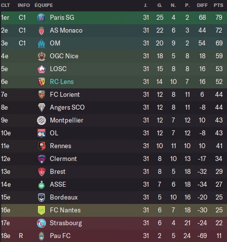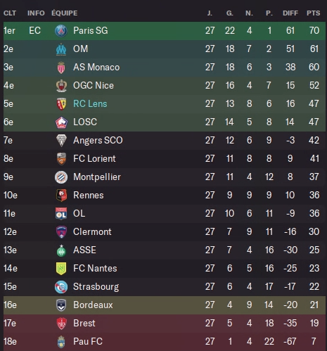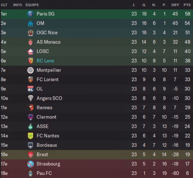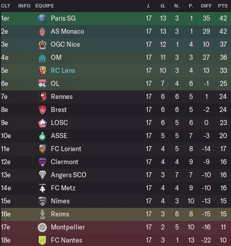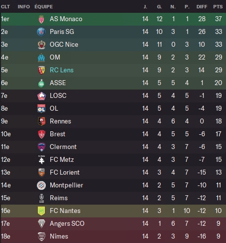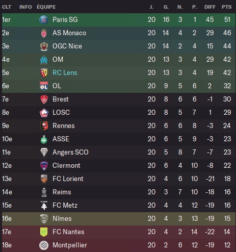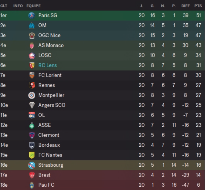 Nous recollons petit à petit ! Nous voilà à égalité avec l’OM à la 4ème place, mais ils nous distancent largement à la différence de buts. Nice n’est qu’à 2 points, et même Monaco à 4 ! Derrière, Lyon est 10 points en retard, et on peut jouer sans regarder dans le rétroviseur !