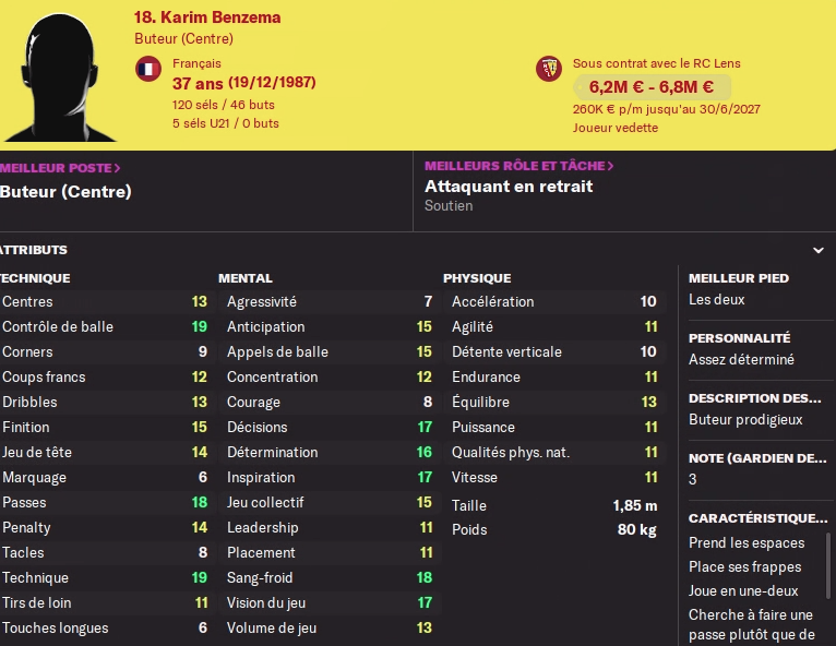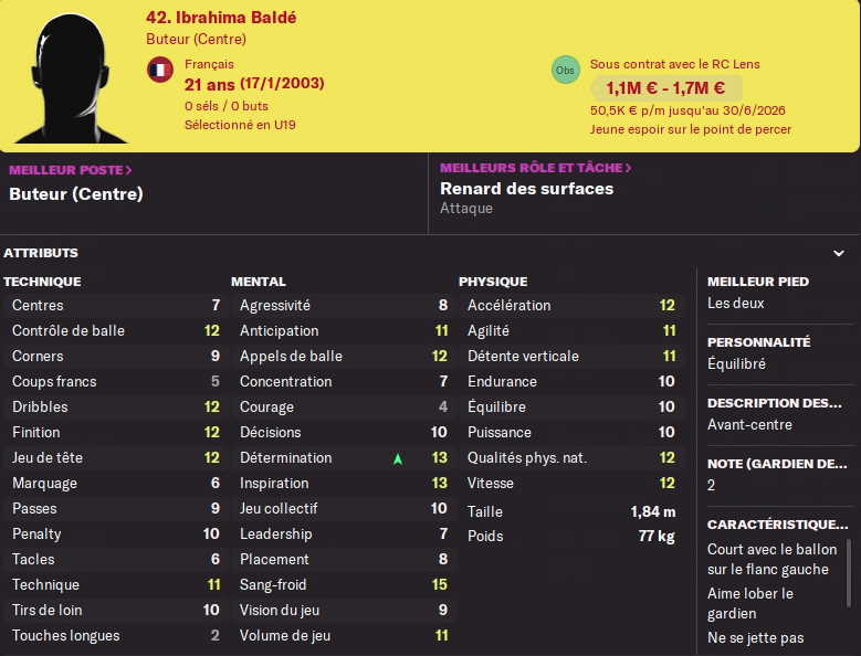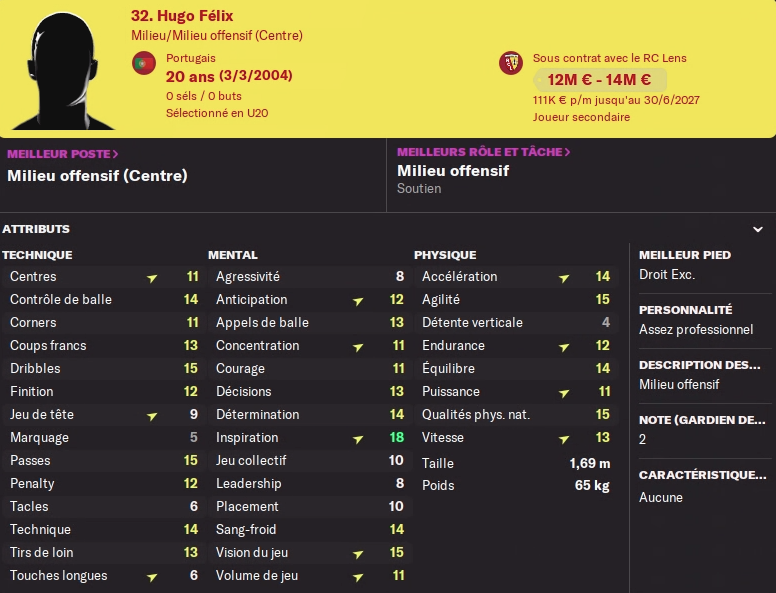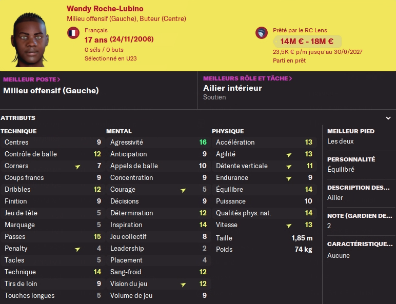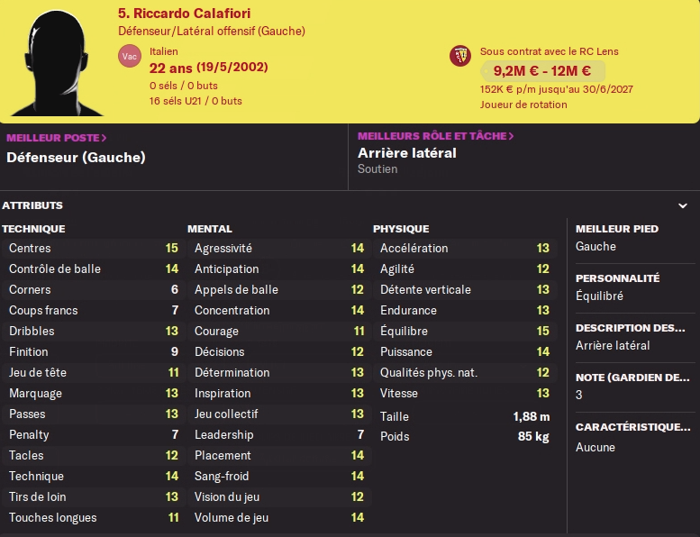 Dans ma quête d’un titulaire au poste de latéral gauche, je suis tombé sur ce joueur avec un bon potentiel et très complet. Pas de véritable point fort mais pas de véritable faiblesse. Avec un peu de progrès il peut devenir un sacré joueur. Il a peu joué depuis deux ans, ce qui explique ses statistiques en berne. C’est un pari assez cher, j’espère donc qu’il prenne !
