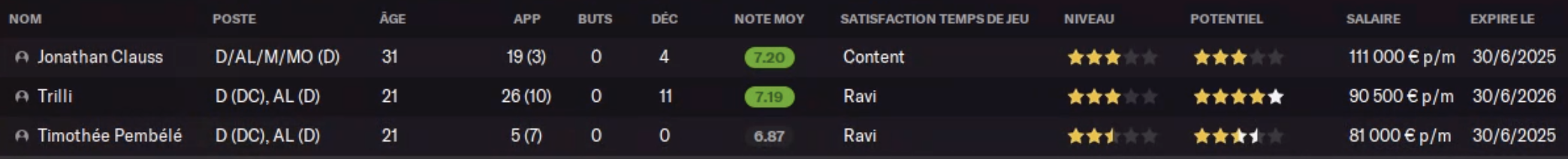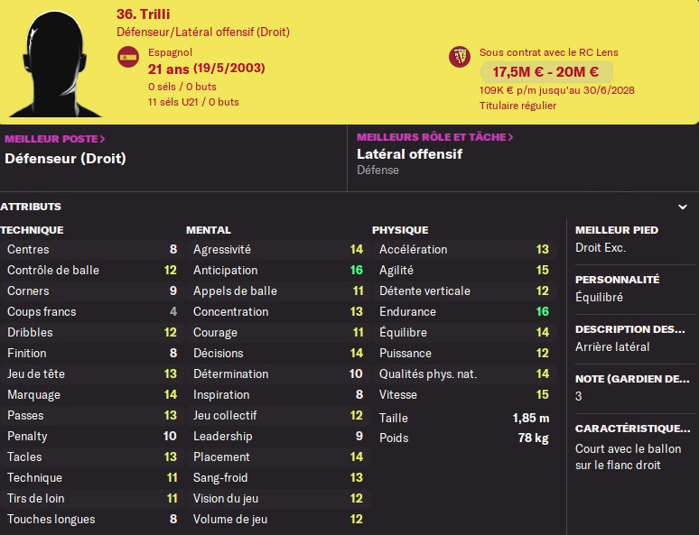 Mon arrière droit titulaire Trilli (cliquez pour sa fiche) m’a clairement fait comprendre que sans grosse recrue au mercato, il partirait en fin de saison. Il ne croit pas en nos capacités à viser la Ligue des Champions. C’est une future star, encore bien jeune, sur qui je compte m’appuyer sur l’avenir, je veux donc le rassurer.