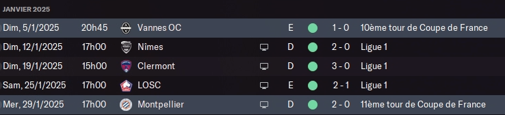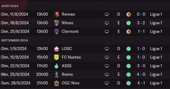 Après le retour à ma tactique initiale, j’ai eu l’impression de retrouver une belle solidité défensive avec 4 clean sheets d’affilée. Ca fait du bien de sentir son équipe solide ! Sur cette série, on tape à nouveau nos rivaux du LOSC (je n’ai toujours pas perdu de points contre eux depuis le début de ma carrière), et nos nouveaux rivaux de Nice dans un sacré carton !