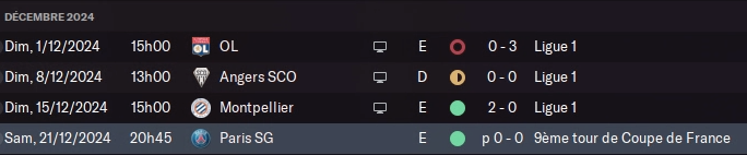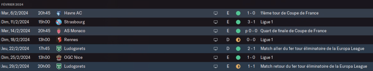 Reste donc la Ligue 1 pour se consoler. C’est un peu dur d’enchaîner les éliminations à peu de temps d’intervalle, espérons que psychologiquement mes joueurs maintiennent de belles performances dans le championnat domestique !