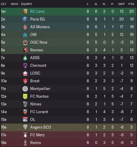 Nous doublons le LOSC à la différence de buts ! Nous prenons la 5ème place mais c’est très fragile. Nice a pris un seul point en 4 matchs et se retrouve à 5 points de nous. C’est rattrapable ! Devant ça reste encore très loin puisque Monaco a 13 points d’avance, l’écart est donc resté inchangé avec la LdC…