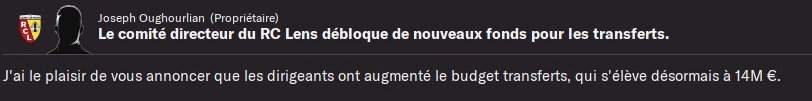 Je recherche à nouveau le même type de recrue qu’habituellement : des jeunes à fort potentiels qui manquent de temps de jeu contre de grosses équipes. C’est les seuls que je peux me permettre de payer, malgré la rallonge de 12M€ de mes dirigeants.
