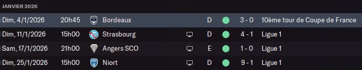 Bonne année 2026 ! Ca ne nous rajeunit pas ! Au programme de ce mois : la réception de Bordeaux en Coupe de France (les Girondins sont en L2 depuis deux ans) et trois matchs de Ligue 1. Programme cool donc, et début d’année civile assez légère avec des matchs contre Strasbourg, Angers et Niort.