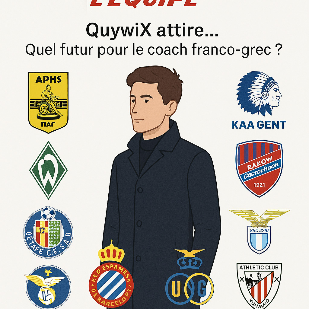 Le jeune entraîneur franco‑grec Théocharis QuywiX s’est imposé comme l’une des révélations du football européen en 2027, après avoir mené l’Aris Salonique au doublé championnat–Coupe de Grèce et à une deuxième finale consécutive de Conference League, au terme d’un parcours marqué par Rennes, Hibernian, l’APOEL Nicosie, Valence puis Bologne. En fin de contrat, le technicien de 36 ans attire désormais une impressionnante liste de prétendants : La Gantoise, le Werder Brême, Raków, Getafe et l’Espanyol se sont positionnés, tandis que des clubs engagés en compétitions européennes comme l’Union Saint‑Gilloise, la Lazio et l’Athletic Bilbao suivent également son dossier de près. Son style énergique, sa capacité à sublimer ses attaquants et à structurer une défense parmi les meilleures du continent ont fait de lui un profil recherché, et ses déclarations récentes, remerciant la présidente Iríni Karipídi qui lui avait offert sa première chance il y a deux ans, laissent planer un doute sur la poursuite de son aventure à Salonique.