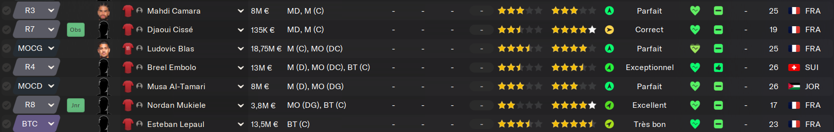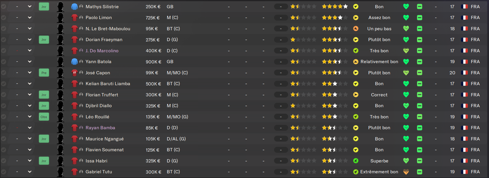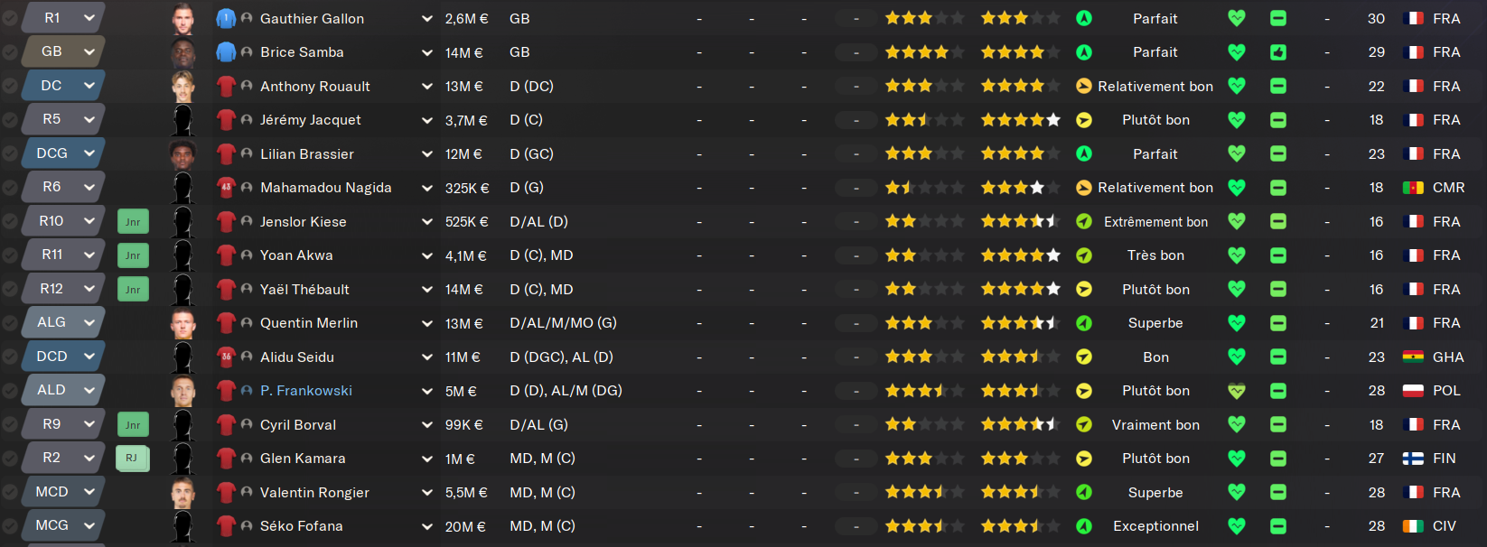 Ne vous fiez pas aux « Jnr » partout, c’est bien l’effectif de l’équipe A, mais on a tellement peu de joueurs que j’ai pas eu le choix de monter tout le monde ![]()